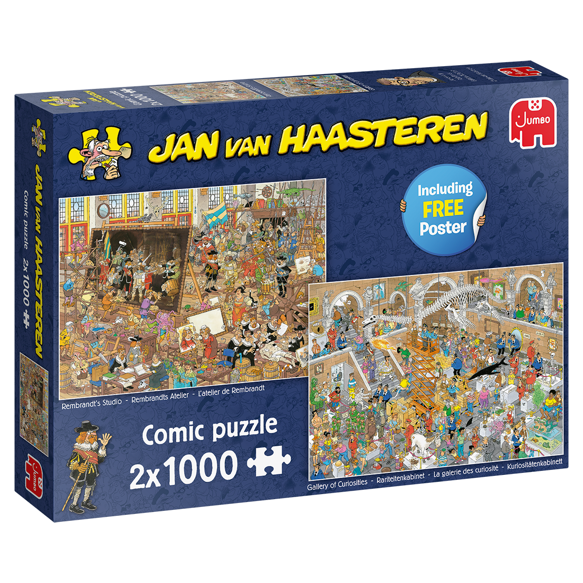 Jumbo - The Jan van Haasteren family is having fun in museums. They are going back in time to visit Rembrandt’s Studio and take a trip to the remarkable Gallery of Curiosities. A Jan van Haasteren puzzle is so much more than just a puzzle, it’s an adventure series with familiar characters playing the lead roles in a never-ending decor full of absurd details. Discover the crazy adventures of the Jan van Haasteren family! We are proud our puzzles are made from recycled cardboard in Europe. To cut the cardboard in puzzle pieces, we use the thinnest knife available. The puzzle has an almost seamless look when finished. Enjoy this Jan van Haasteren puzzle!