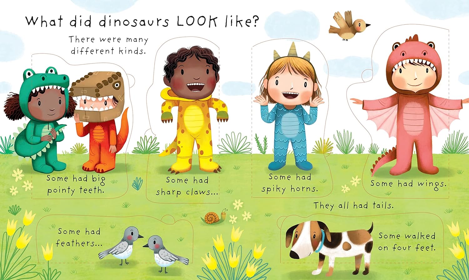 We see dinosaurs on TV and in books, but where have all the REAL ones gone? How BIG were they? Did they have feathers? What did they eat? And how do we know so much about them? This charming book allows young children to find out for themselves.