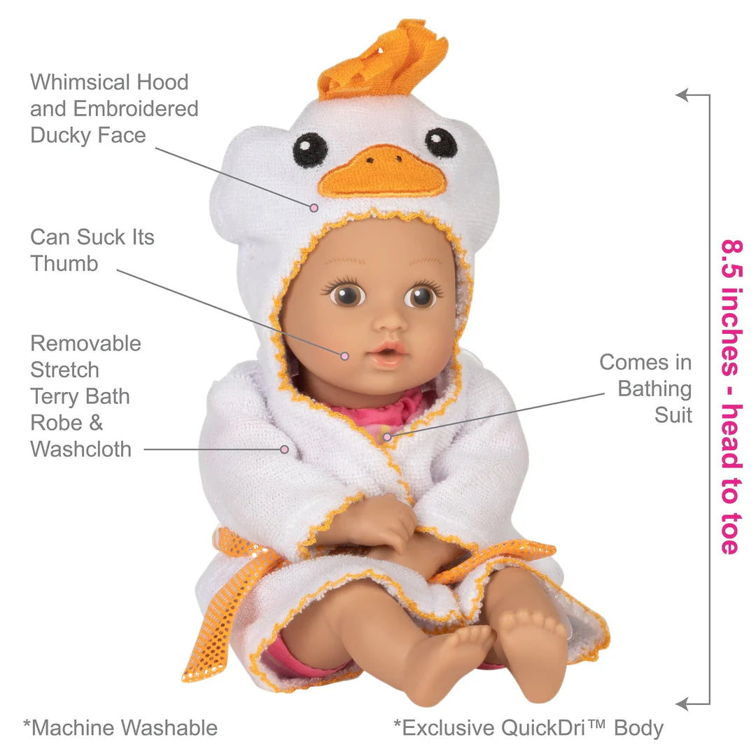 Underneath her embroidered, hooded Ducky bathrobe is a pink baby doll swimsuit printed with tiny white polka dots. From her tiny little nose to her belly button, this BathTime baby doll bath and toddler pool toy is an absolutely ADORAble doll toy for your kids, with a perfect blend of sweetness and love!