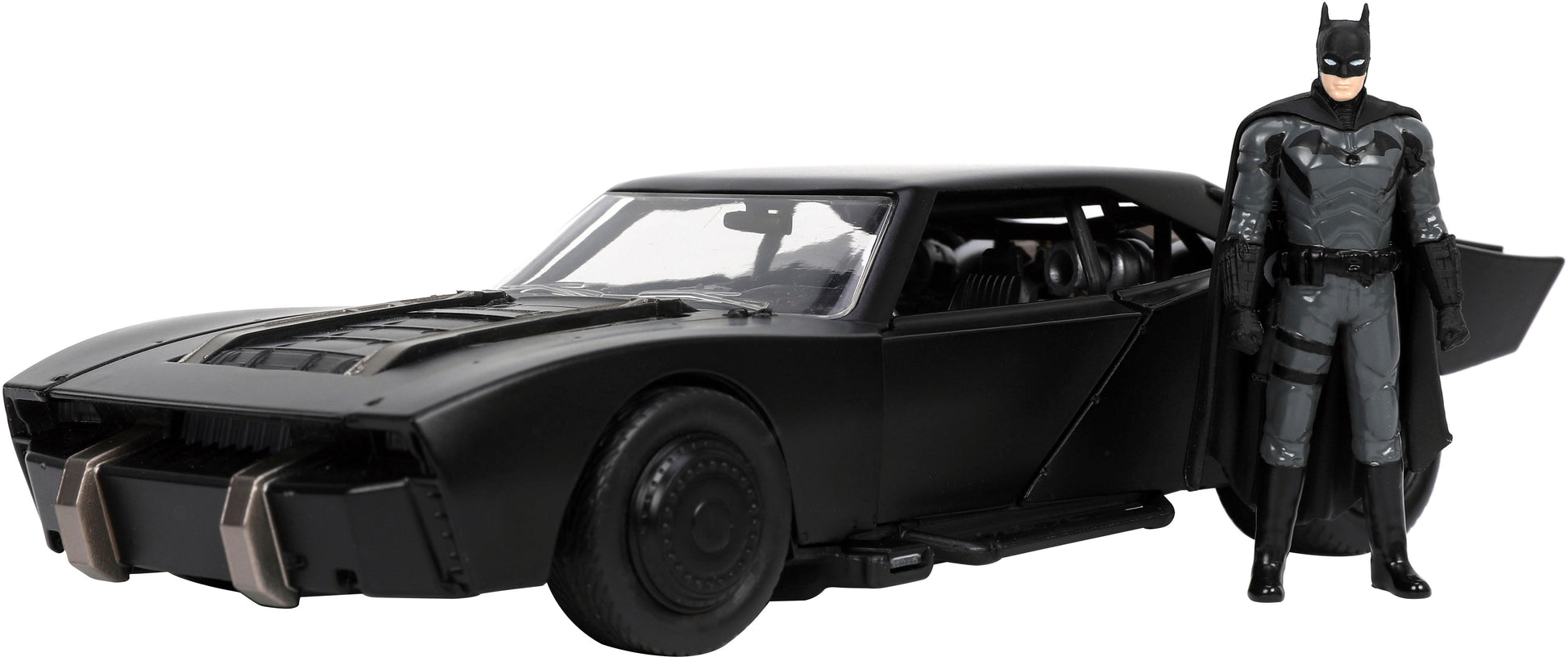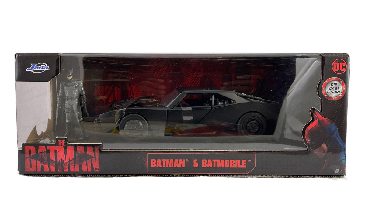Jada Toys - DC Comics | 2022 "The Batman" Batmobile™ with Batman™ Diecast Figure. DC Comics diecast collectible model toy. This Batmobile™ is an 8.25"L x 3.75"W x 2"H diecast metal car. The Batman™ figure is approximately 2.75 inches tall. This car is manufactured by Jada Toys.