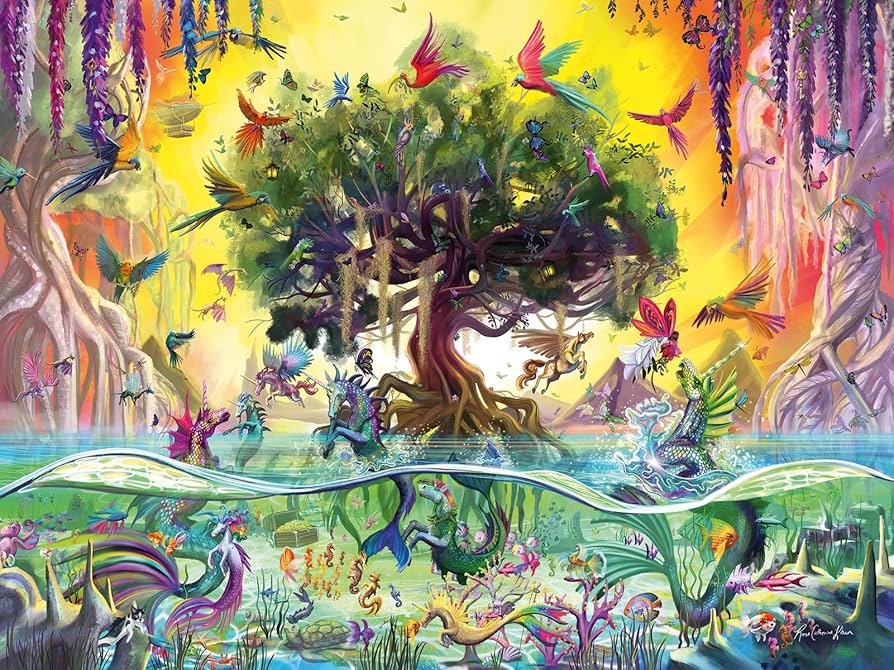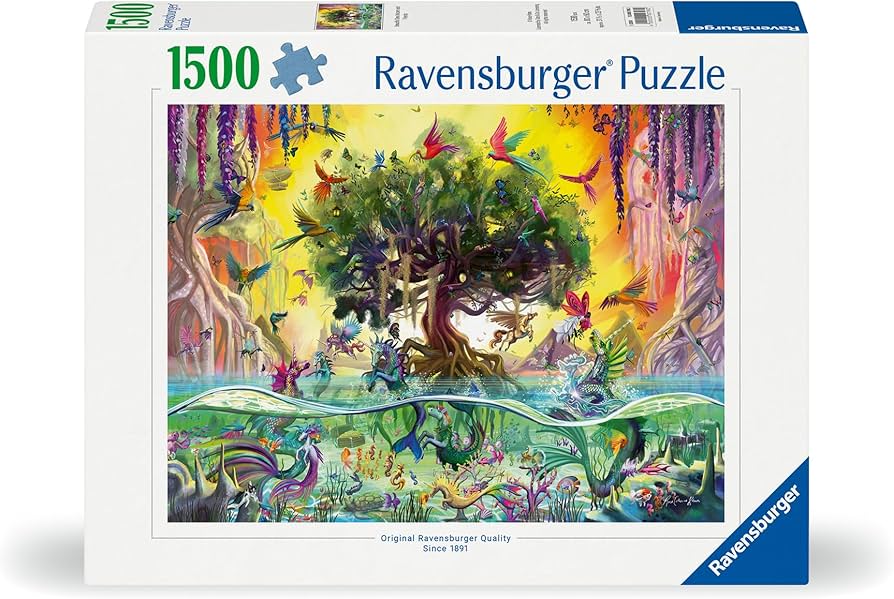 Ravensburger - Enjoy a treasure trove of factual and fantasy creatures in this “Sea Unicorn” 1500-piece puzzle for hours of relaxing fun! Along with sea unicorns and alicorns (flying unicorns), there are tropical dragons, fairies and more. The mangrove-inspired trees provide a safe haven for birds, butterflies and an assortment of animals. Artist Rose Khan has also included her signature characters; can you find the keys and three ‘kitties’? Enjoy some me-time with this beautifully illustrated puzzle today!