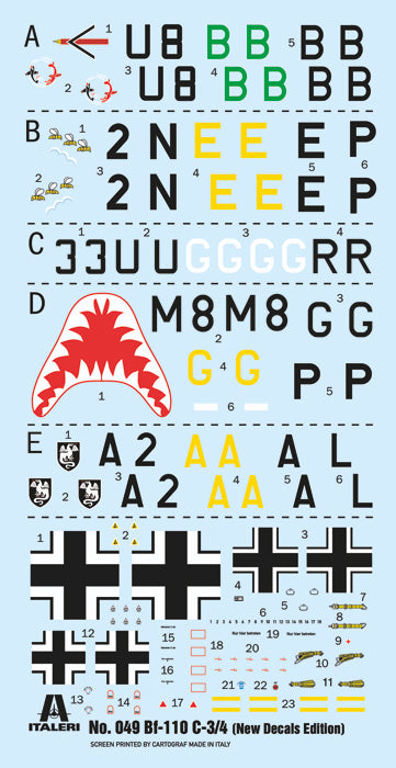 Italeri plastic model kit - Alongside the Messerschmitt Bf 109 fighter and the Junkers Ju-87 Stuka dive bomber, the Messerschmitt Bf 110 Zerstörer is considered one of the symbols of the Luftwaffe during the Second World War. The Messerschmitt's heavy multi-role twin-engine fighter was extensively employed by the German air force during the war and, in its various versions, used to fulfill several operational roles: interceptor, fighter-bomber, reconnaissance, anti-ship aircraft, and night fighter. Its two Daimler-Benz DB 601 engines, capable of delivering 1200 hp, allowed the heavy fighter to reach a maximum speed of 560 km/h. Versions C and D were widely deployed on all fronts from the early stages of the war. Heavily armed with two 20mm cannons, four 7.92mm machine guns, and a rear machine gun for self-defense, it could carry bombs or additional fuel tanks under the wings to increase its operational range.
