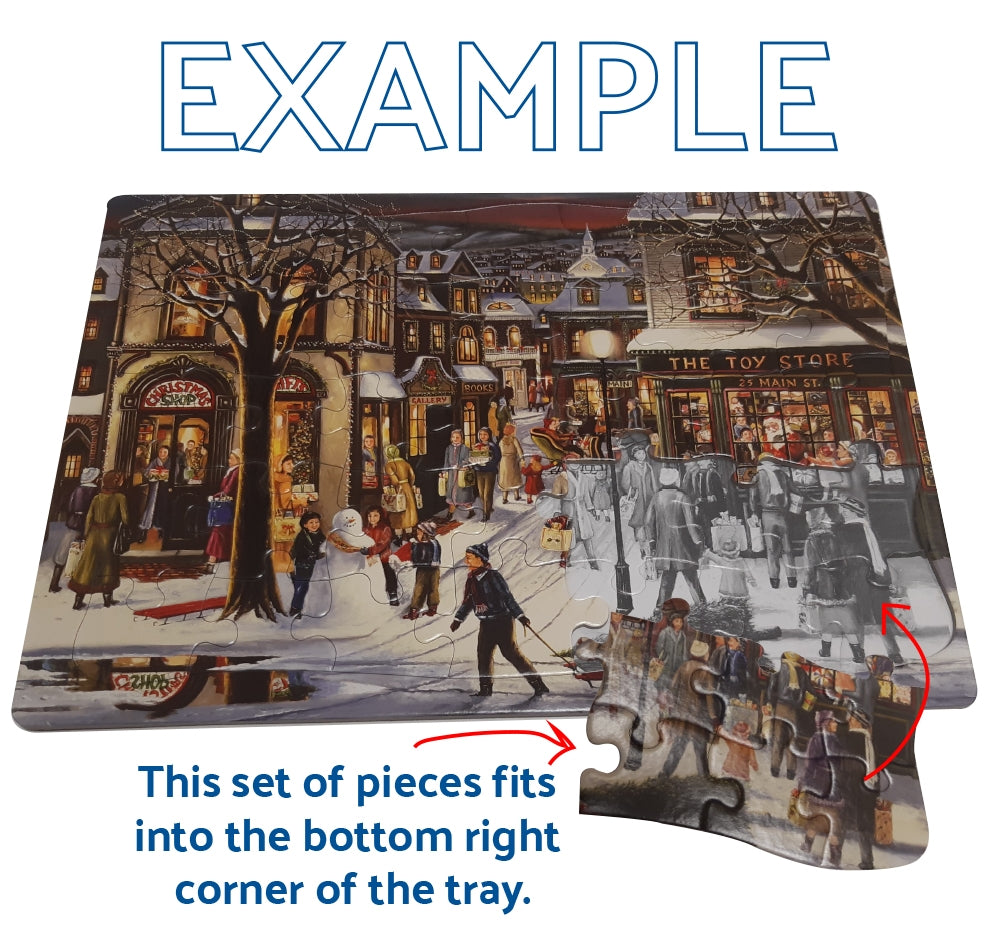 A tray puzzle is durable inlaid pieces in a tray with definitive outlines underneath to help idenity where each piece goes. The large pieces makes it easy for hands to grasp and allows for those needing more visual cues to see a greater portion of the image per piece. Recommended for ages 3+.