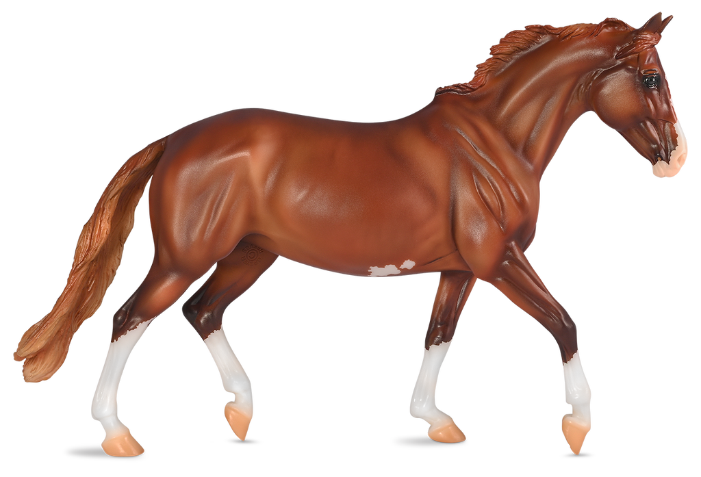 Breyer - If a flashy realistic color is more to your tastes, then Calista will be a welcome addition! This beautiful warmblood mare sports a beautifully-shaded chestnut sabino coat with high stockings and a blaze. Warmbloods are prized in equestrian sports for their athleticism, intelligence, and versatility, and she has them all in spades. Calista is their fall “Brick and Mortar” special run, meaning she is only available in-person at local Breyer retailers.