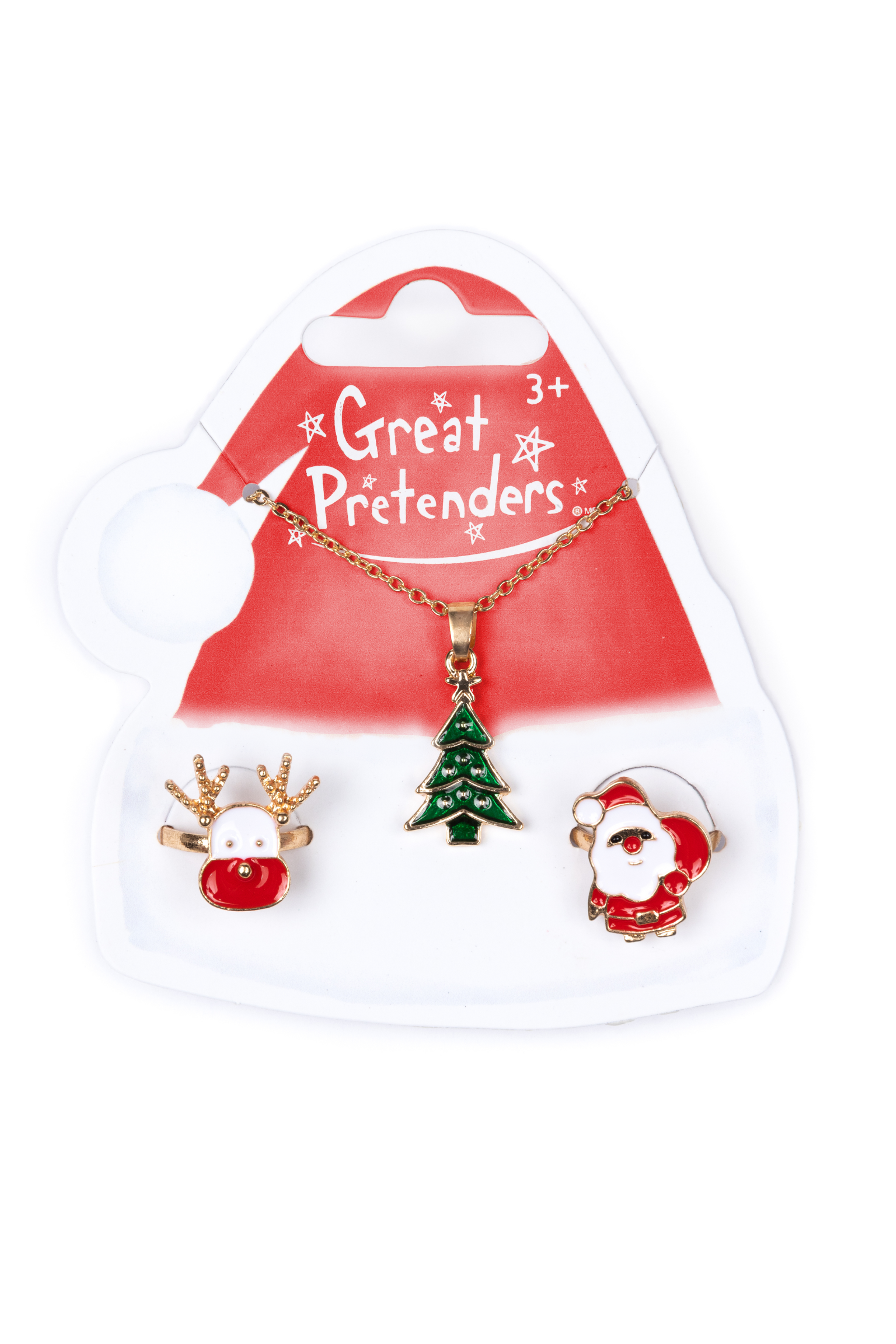 Great Pretenders - Add a little holiday bling with our Christmas Tree Necklace and Ring 3-piece set. This festively fun trio consists of two rings with Santa and reindeer designs and a gold chain necklace with a Christmas tree pendant.