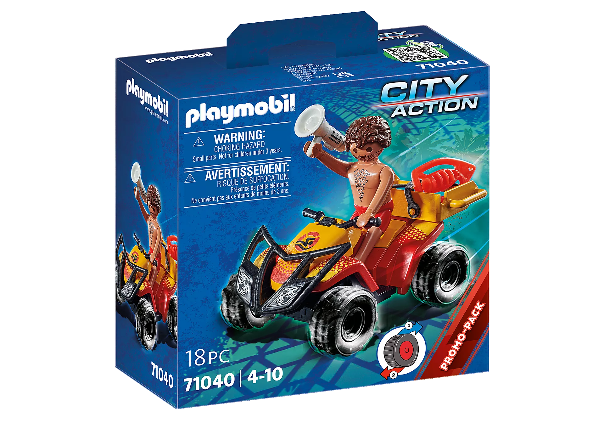 Get ready for exciting adventures on the coast with the PLAYMOBIL Beach Patrol Quad! Whether on the beach or in the water, the lifeguard always has everything in view to be on the spot quickly in an emergency. With his maneuverable quad with the thick tires, he drives up and down the beach and attentively watches swimmers and bathers. With its practical pull-back motor, the Beach Patrol Quad ensures action-packed rescue operations in the children's room. A great gift for birthdays, Christmas or other occasions for kids aged 4 and up. Specifications: The 18-piece play figure set includes a PLAYMOBIL figure, a quad with pullback motor, suntan lotion, megaphone and swimming board. Life buoy and megaphone can be stowed on the carrier and fixed with the silicone straps. Play with this set on its own or combine it with the other playsets in the PLAYMOBIL City Action series.