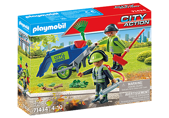 Playmobil - To keep our streets and roads safe for everyone, they need to be cleaned regularly. The PLAYMOBIL Street Cleaning Team frees them from leaves and dirt. Includes two figures and trash can to push.