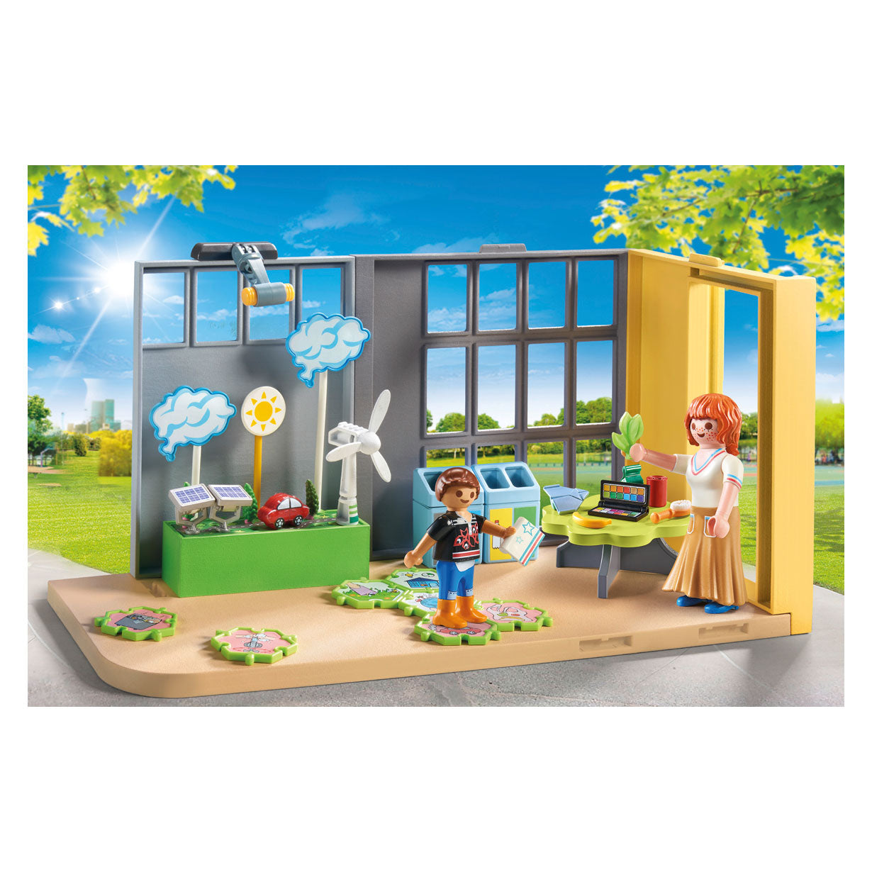 The toy set contains two PLAYMOBIL figures, a climate model, a table, four trash cans, a pencil, a paint box, a puzzle with climate protection tasks and many other extras for creative role play. The playset can be played with on its own or combined with the Large School (71327 - sold separately).