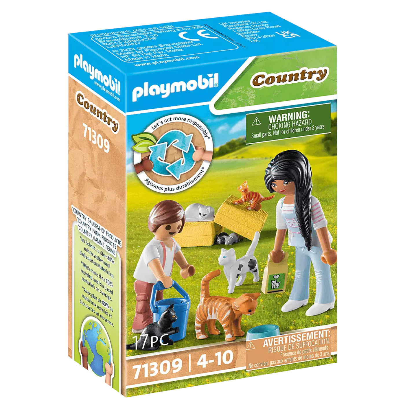 Playmobil - Cats can be found on almost every farm. The fluffy furry friends have just had kittens and are supplied with food by the children. The little kitties are already playing happily and chase each other around the bales of straw. A great gift or souvenir for cat fans aged 4 years and up. The 17-piece toy set includes two PLAYMOBIL figures, three cats, two kittens, two mice and other extras.