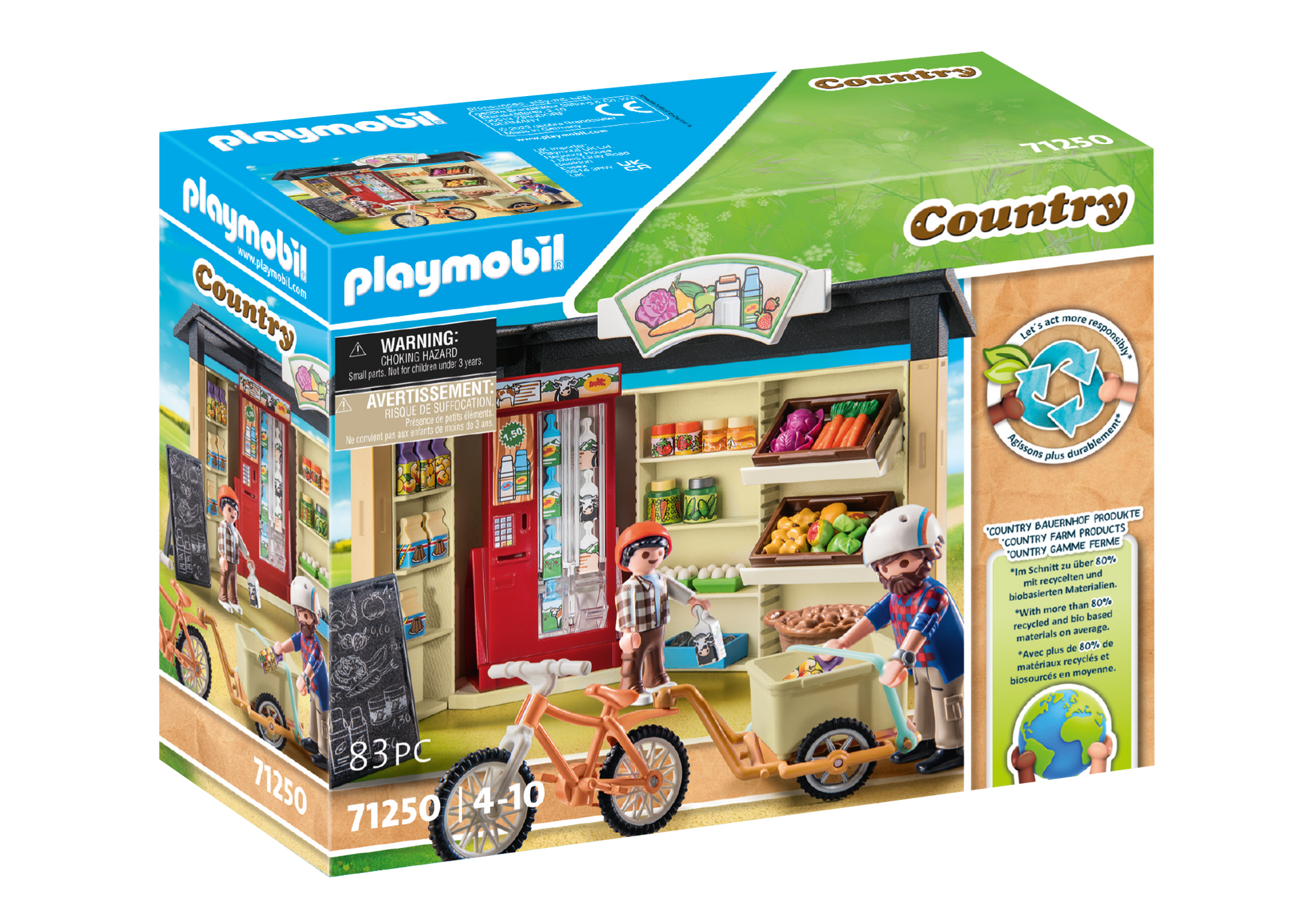 • The 83-piece PLAYMOBIL toy set includes two PLAYMOBIL figures, a farm shop with milk vending machine, eggs, fruits, vegetables and various other food items.
