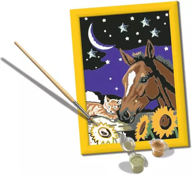 Help your child feel as content as this cute kitty and young horse with a fun and satisfying activity. Our “Friendship” CreArt paint-by-numbers kit comes complete with everything needed to make and display their very own masterpiece, including glittering star gems! Success is simple, with color-outlined sections and matching, odorless acrylic paints to ensure picture-perfect results. Finish in about 4 hours, let dry, then use the included frame to proudly display your budding artist’s talent!