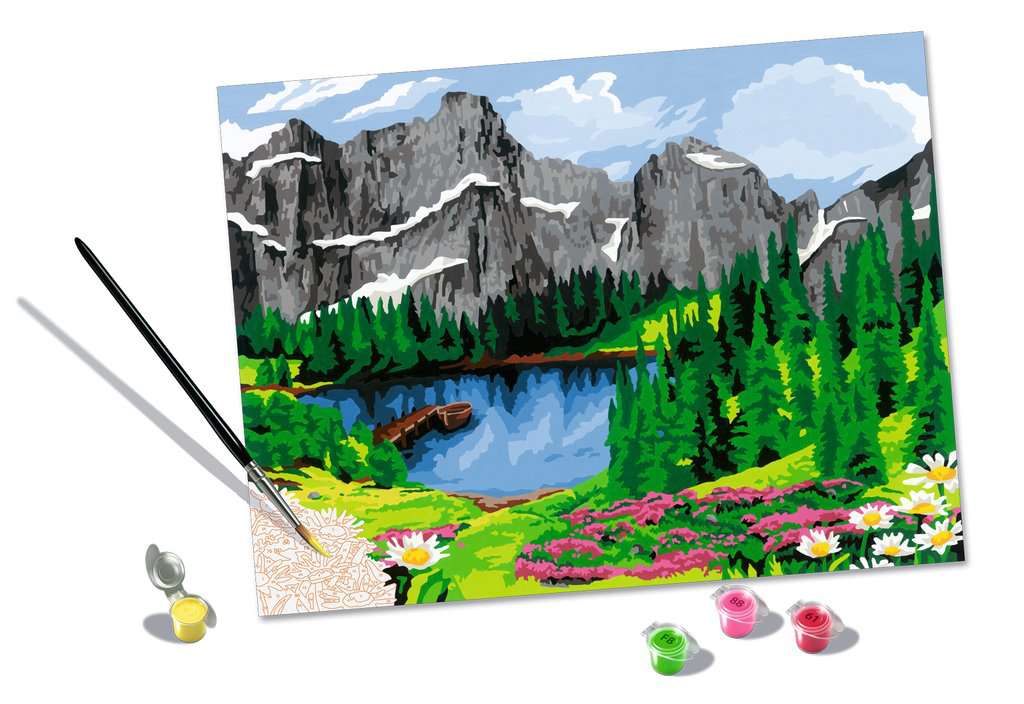 CreArt - Create your piece of paradise — a crystal-clear lake, beautiful blooms and a breathtaking “Mountain View” with this CreArt Painting by Numbers set!