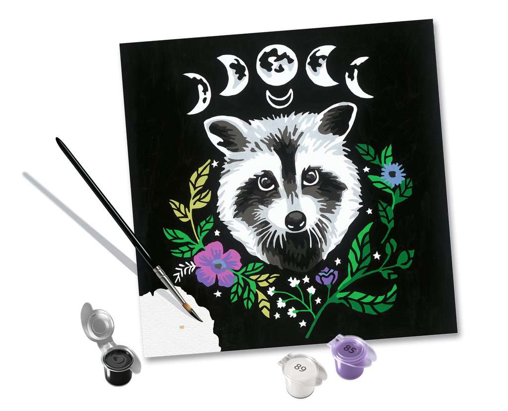 Relax your mind and go to your peaceful place with no screens and no demands as you paint this entrancing “Raccoon” with phases of the moon by artist Pixie Cold. Our delightful CreArt paint-by-number kit makes it easy! Simply fill in each clearly numbered section and watch the image emerge. The prepared patterns and high-quality, odorless acrylic paints ensure excellent results as you create your personal masterpiece. De-stress and find success as you discover the joy of art in your heart today!