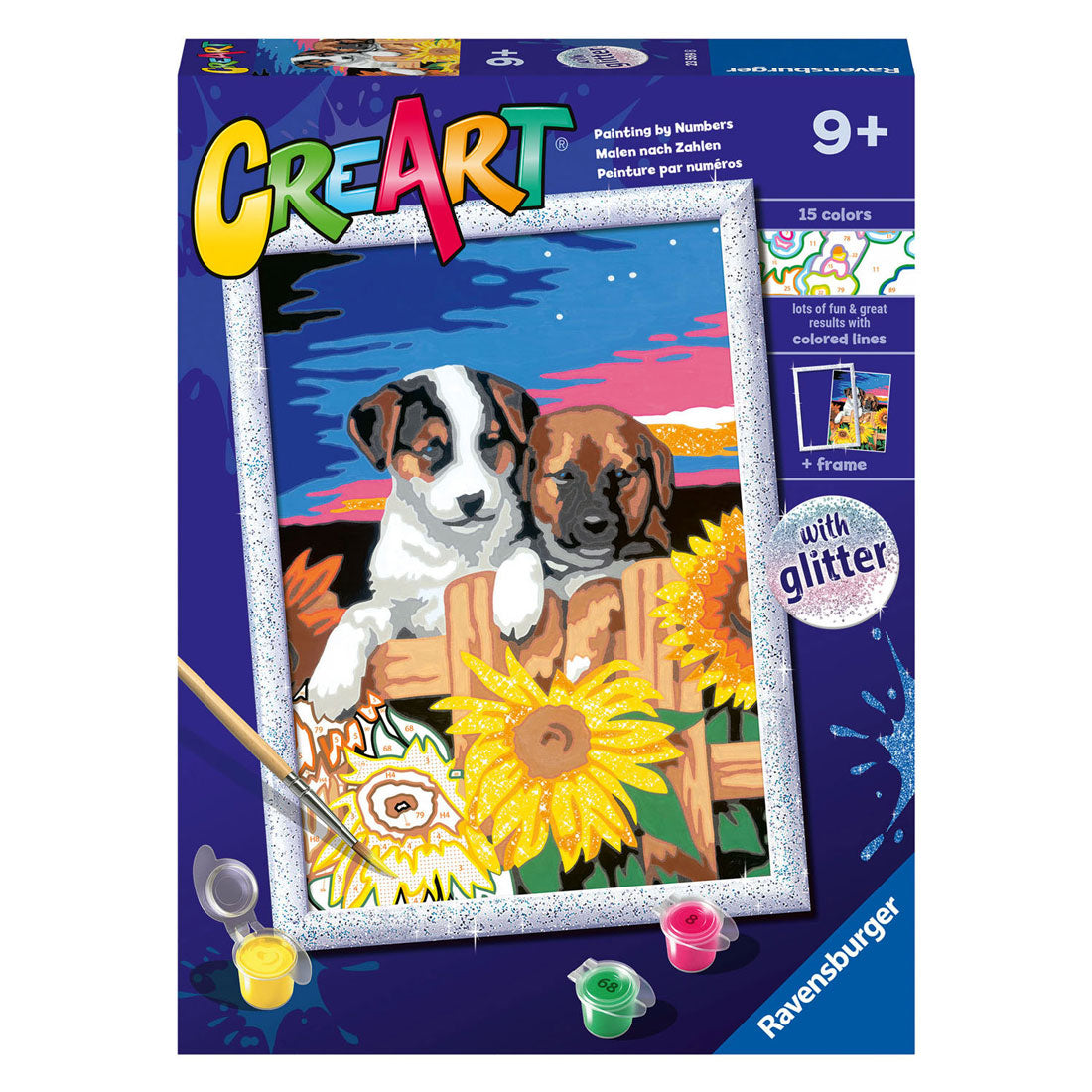 CreArt - Shimmering sunflowers, a sparking sky and precious puppies are here for the making with this “Sunset Paw-fection” CreArt Painting by Numbers set!