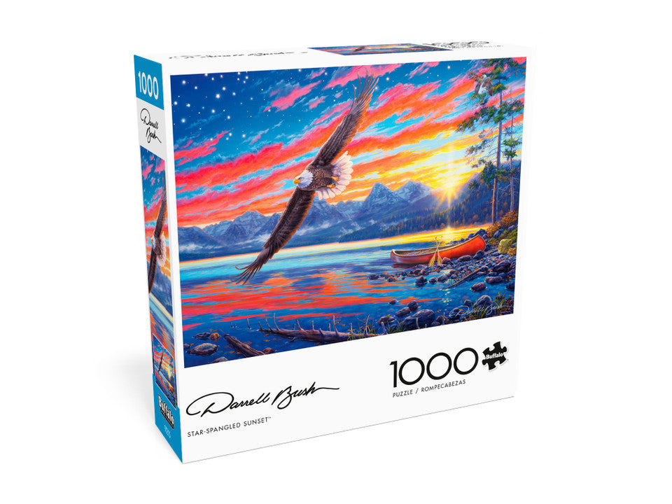 Buffalo Games - This 1000-piece jigsaw puzzle, Star-Spangled Sunset, is based on the artwork of Darrell Bush. This puzzle features a Bald Eagle soaring in front of a sky of stars and stripes.