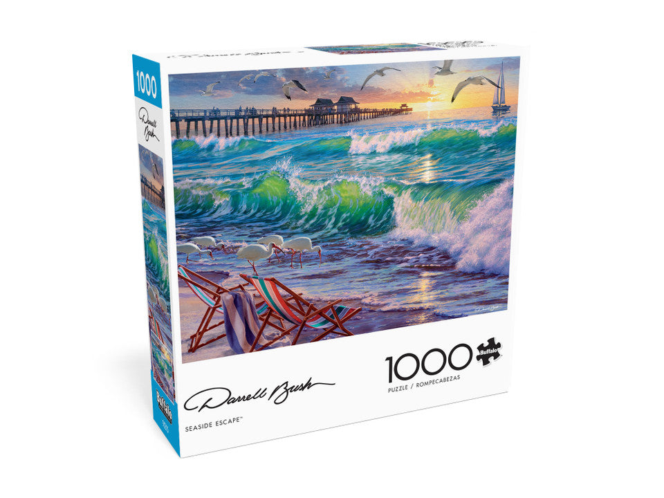 Buffalo Games - Seaside Escape is a 1000-piece jigsaw puzzle from the Darrell Bush collection by Buffalo Games. Enjoy piecing together waves crashing against the shore as the sun dips into the ocean in this tranquil scene.