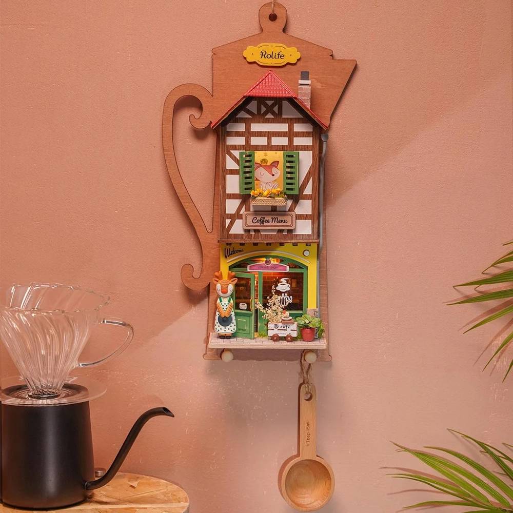 Robotime - Lazy Coffee House is a multi-functional Wall Hanging Miniatures that can be either a part of your home wall decor or transform into a miniature house desk decoration easily. Come with LED lights, let'ts lighten up this coffee shop of Ms. Giraffe, who loves listening to her customers' life stories.