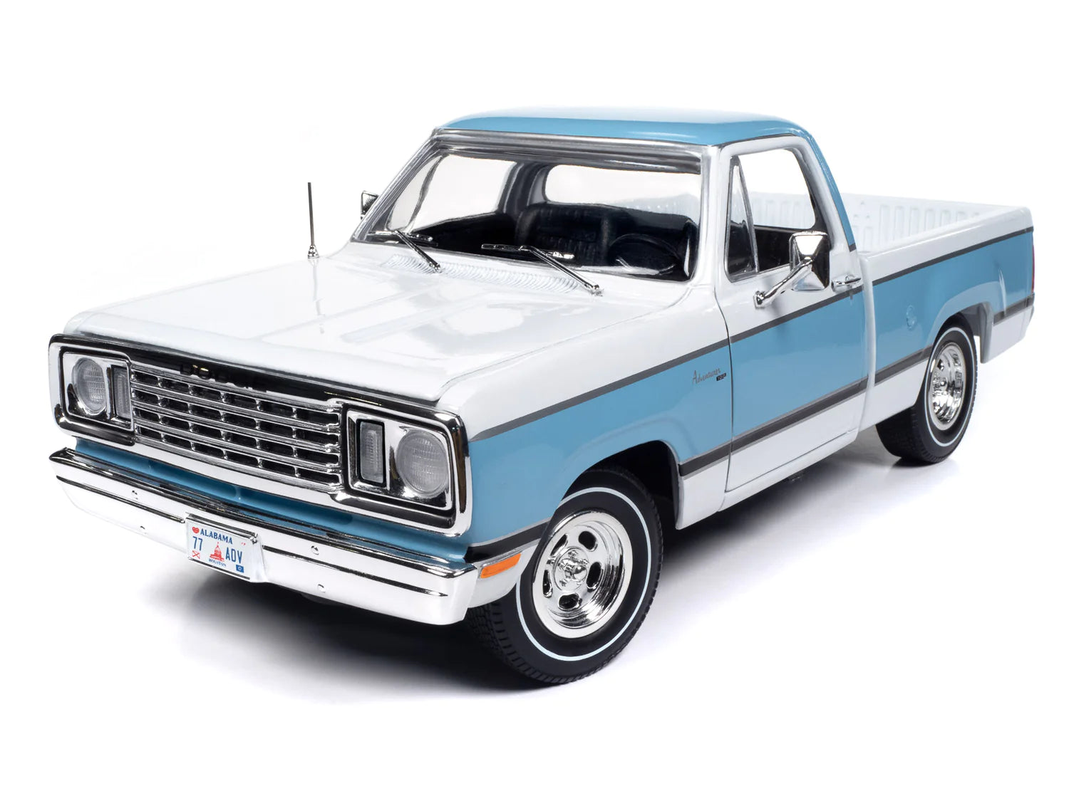 Autoworld - The third generation of the Dodge D Series, which ran from 1972 to 1980, included three body styles: the Utiline, the Sweptline, and the Club Cab. Out of the three, Auto World is excited to replicate this 1977 Dodge D100 Adventurer Sweptline—a full-sized pickup truck that offered a combination of power, comfort and style. Under the hood was a 360 cubic inch V8 engine that delivered 175 horsepower and 285 lb.-ft. of torque paired to an optional automatic transmission. The Adventurer D100 Sweptline also had a spacious and well-equipped interior, with bench seat, and an AM/FM radio. Classic Dodge D-series pickups have been a workhorse for an entire generation of working families. This carefully-crafted 1:18 scale 1977 Dodge D100 Adventurer Sweptline is smothered in factory-matched two-tone light blue and white paint, plus chrome bumpers and wheels. Also, for the first time, this Dodge pickup features a newly-tooled Sweptline bed, tailgate, and taillights!
