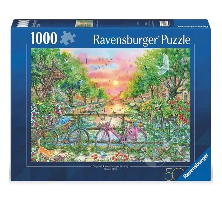 Ravensburger - As part of Ravensburger's 50th anniversary, explore the bicycle capital of the world and enjoy a glorious sunset reflected in one of the city’s many canals in this "Dreamy" version of Bicycles in Amsterdam puzzle!