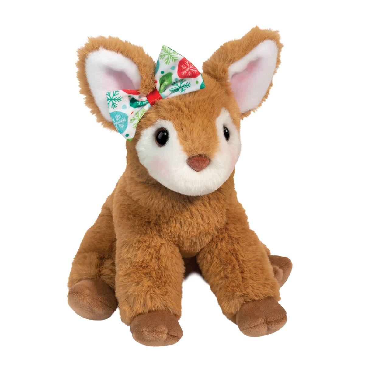 Douglas Cuddle Toys - Dressed to impress at this season’s parties, Fernie the Soft Fawn stuffed animal will be a welcome addition to your holiday fun! Fernie sports a lively bow at her right ear that features vibrant colors and a merry snowflake motif. Ultra soft plush materials in cozy shades of brown beg to be cuddled and held. We’ve weighted Fernie’s feet and bottom with just the right amount of beans and selected silky polyester fill to enhance her squeezably soft feel. Soulful, dark eyes and oversized ears accented with rosy, pink airbrushing will catch the eye of discerning animal lovers, while simultaneously finding a place in their hearts. Surprise someone special this season with Fernie the plush Fawn!