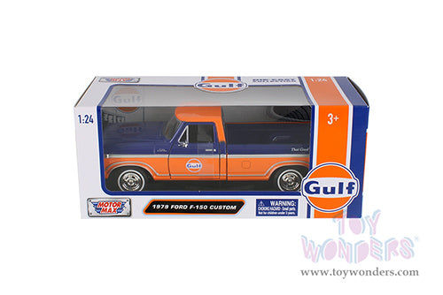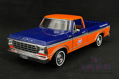 Motormax - Ford F-150 Custom Pickup "Gulf". 1:24 scale diecast collectible model car. This Ford F-150 Pick-up is a 9"L x 3.5"W x 3"H die cast metal with openable doors & free wheels. The '79 Ford F-150 Custom Pickup Truck is manufactured by Motormax. 71652CM is in dark blue with orange. Individually packed in a window box.