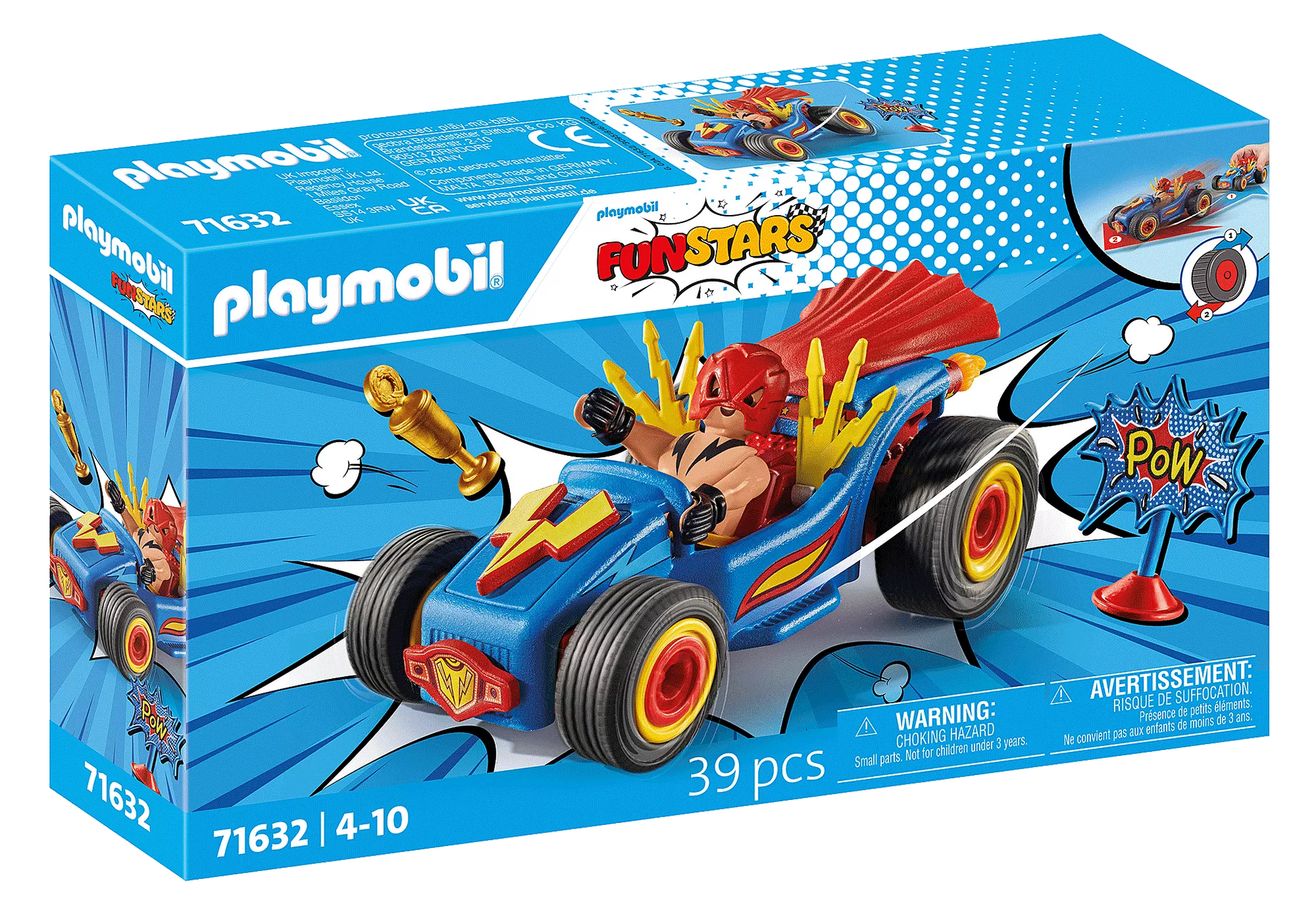 On your marks, get set... Without hesitation, the wrestler zooms off in his kart with a retractable motor. Engage in a race with vivid flashes, fluttering capes, fiery exhausts, effortlessly leaving competitors behind. Exciting races, navigating obstacles, or crazy stunts - the PLAYMOBIL Funstars are here! This crazy PLAYMOBIL car will thrill all wrestling fans. The dynamic new body can be outfitted with various accessories. There's room for a PLAYMOBIL figure inside the vehicle. With the convenient retractable motor, high-speed play adventures are guaranteed. A fantastic gift or souvenir for car-loving children aged 4 and up.