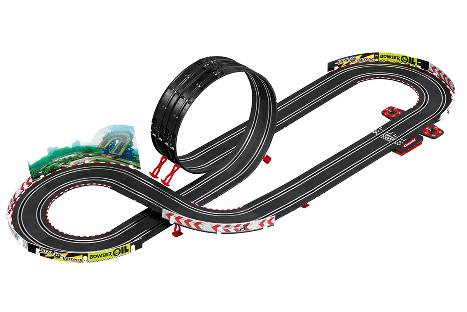 Get away from the console and into the children's room: On this 4.9-meter-long Carrera GO!!! race track on a scale of 1:43, you now have the cult game at your fingertips. The two vehicles on a scale of 1:43 are occupied by the characters Mario and Luigi from Mario Kart™. The track has a few surprises in store for the two rivals. The winding track and the looping section require full concentration. In addition to the race track and the two slot cars, the set also includes two speed controllers with turbo button, a transformer and a track lap counter. Another highlight are the special Mario Kart™ decoration elements for the race track.