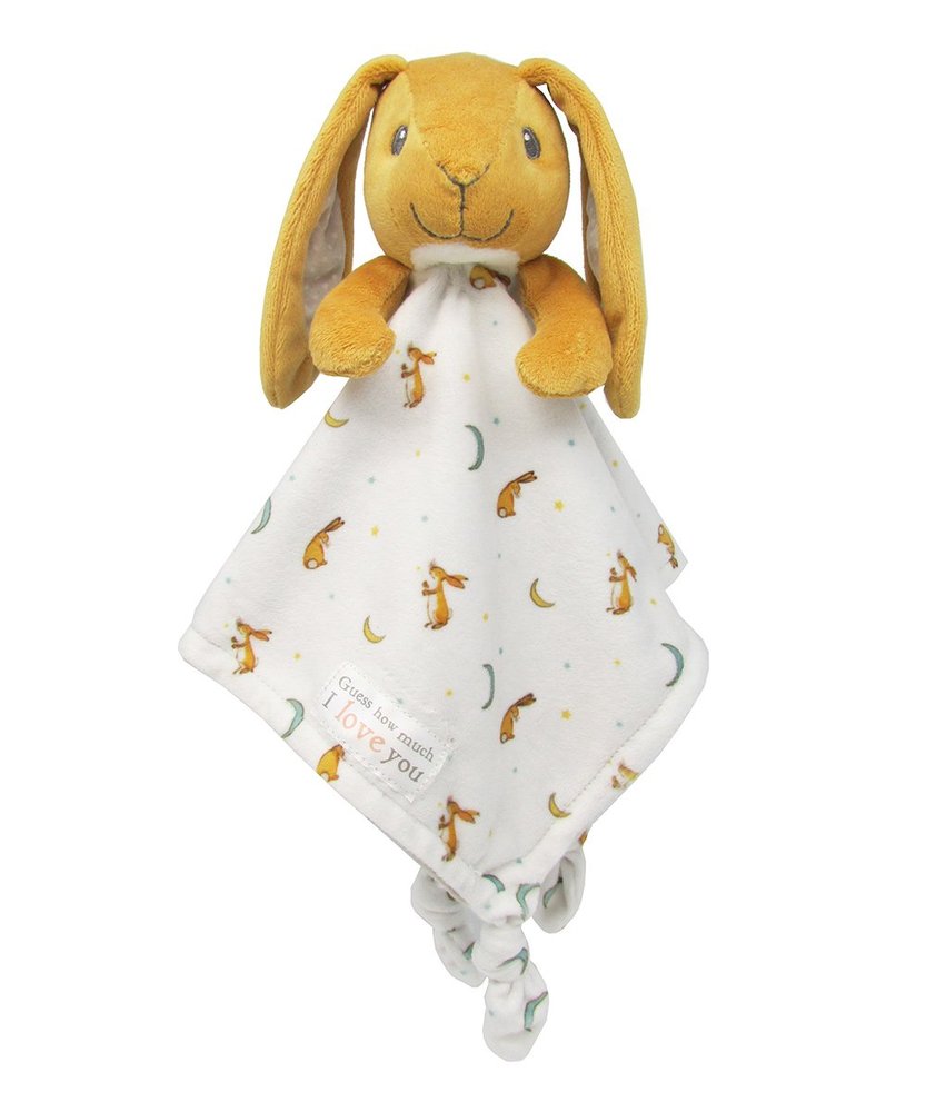 Kids Preferred - The Guess How Much I Love You™ Snuggle Blanky features the beloved Nutbrown Hare from the classic children's book from Sam McBratney. Your little bunny will love to cuddle and snuggle with this part-plush, part oh-so-soft cream blanky featuring the phrase "I love you right up to the moon and back" embroidered below the sweet bunny. The blanket itself is edged with silky green satin trim, and has a bunny print on the underside. The Snuggle Blanky is 100% machine-washable, and suitable for newborns and older.