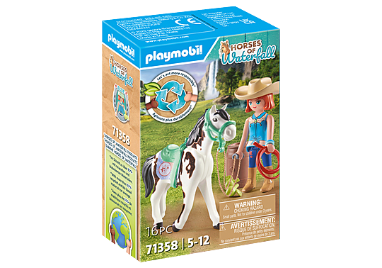 Playmobil - Ellie's greatest passion is western riding. Her Tennessee Walker mare Sawdust, whose coat is flocked, also loves the challenge of working as independently as possible and reacting only to the slightest weight and thigh aids from Ellie. In order to influence Sawdust less via the reins, Ellie rides one-handed - like a real cowgirl! During horseback riding training at Waterfall Ranch, the two make several laps around a barrel.
