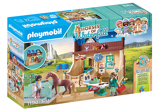 Playmobil - At Phil and Harleen's riding therapy and veterinary practice, animals and humans are helped! The clinic, which can be attached to the Waterfall Ranch, offers a wide variety of examination and treatment methods for sweet patients. The Aquatrainer, a pool with included treadmill that can be filled with water, allows equine therapist Phil to get struggling horses back on their hooves. Meanwhile, budding veterinarian Harleen nurses kittens and guinea pigs back to health. People with handicaps and special needs use the Waterfall Ranch's great offerings for therapeutic riding and equine therapy. Therapy horse Zora is especially popular with the patients. Fun Fact: Harleen has great respect for horses and is therefore very happy to take care of the small animals at the animal clinic.