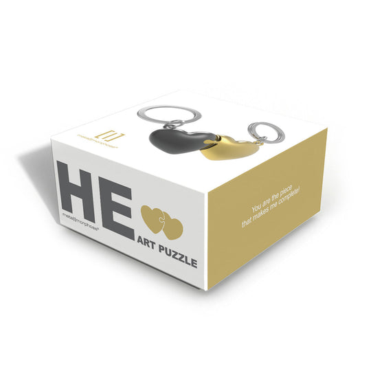 This keychain features 2 keyrings that can be piece together to form a heart in gold and grey combination.