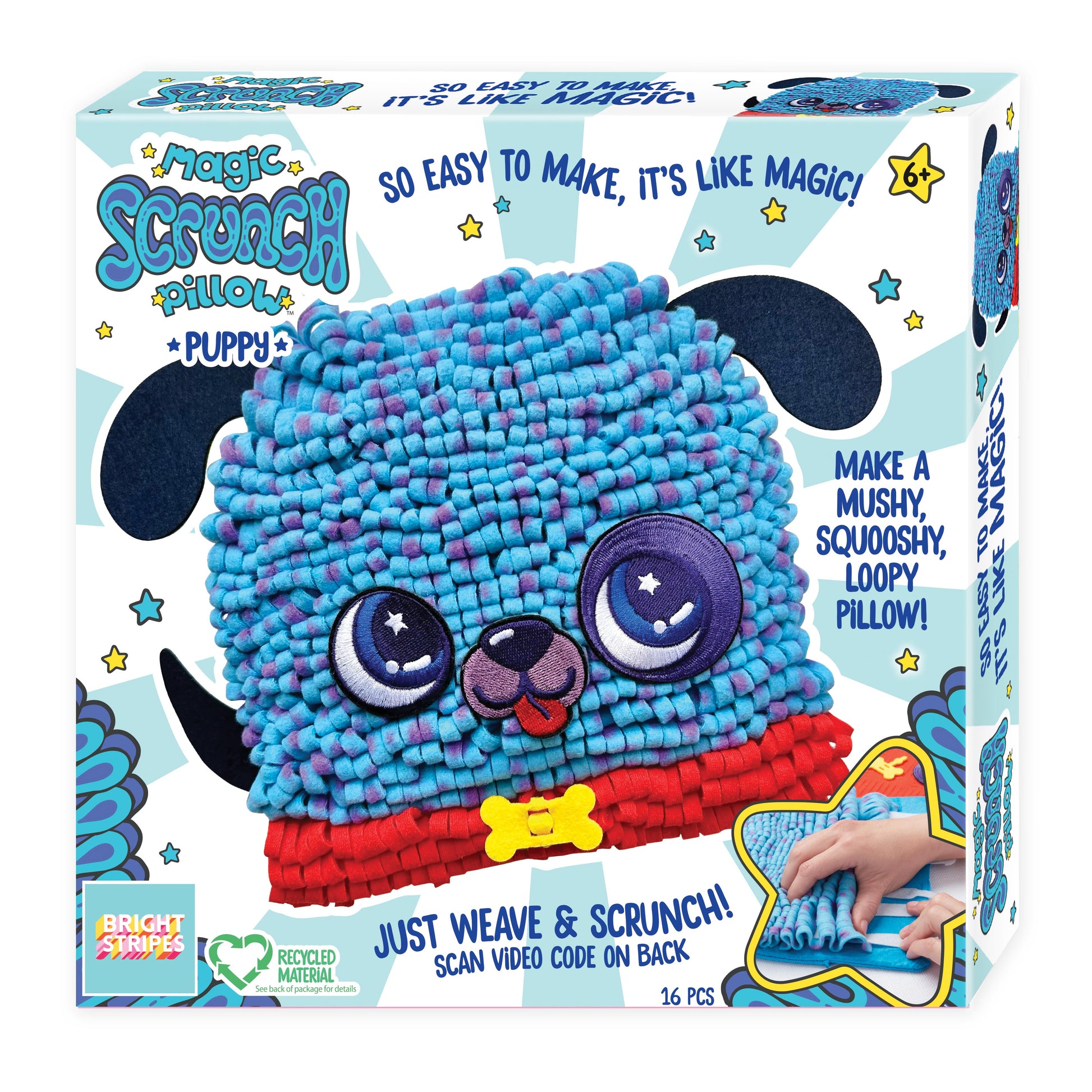 Bright Stripes - Just weave, scrunch, and stuff an adorable, loopy Puppy pillow! This totally unique, no-sew, patent-pending system allows you to create an impressive, squishy character in less than an hour! So easy, fast and fun! The Scrunchy Puppy has beautiful, embroidered peel-and-stick features and felt ears and tail that weave right on. The super-soft, thick fleece, felt pieces and pillow stuffing are all made of 90-100% post-consumer plastic bottles! Such a fun project to make, no matter the skill level!