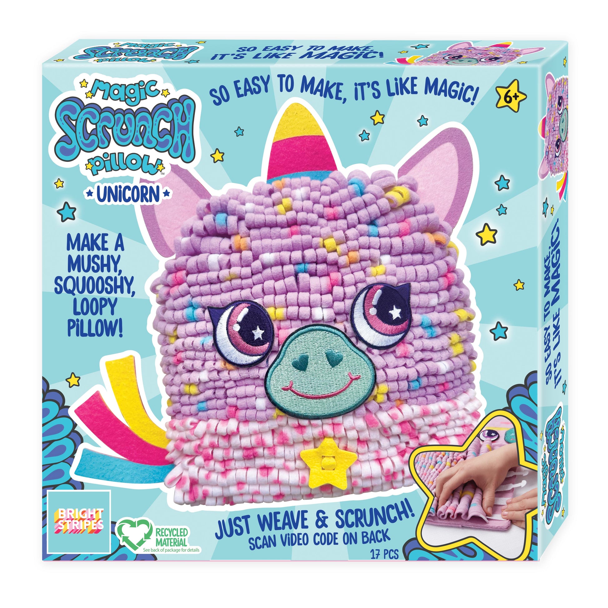 Bright Stripes - Just weave, scrunch, and stuff an adorable, loopy Unicorn pillow! This totally unique, no-sew, patent-pending system allows you to create an impressive, squishy character in less than an hour! So easy, fast, and fun! The Scrunchy Unicorn has beautiful, embroidered peel-and-stick features and felt ears, horn and tail that weave right on. The super-soft, thick fleece, felt pieces and pillow stuffing are all made of 90-100% post-consumer plastic bottles! Such a fun project to make, no matter the skill level!