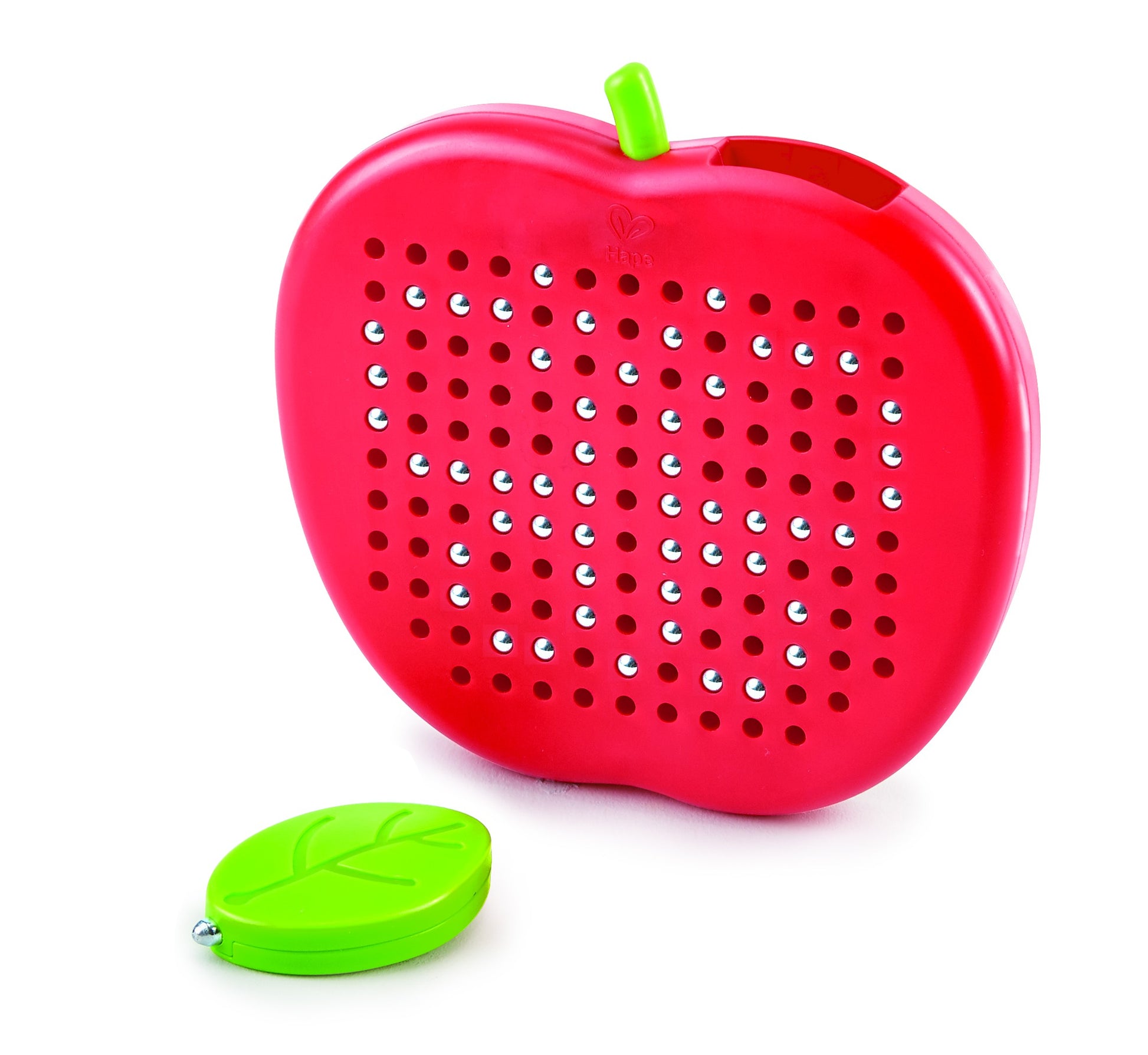 Hape - This bright red apple is filled with metal balls. Use the attached magnetic leaf pen to create pictures, patterns, anything you like.