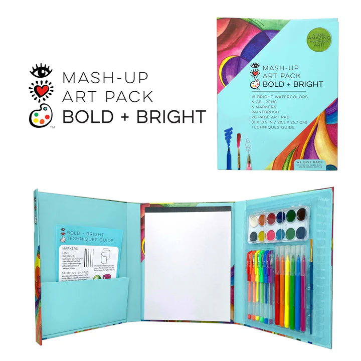 Bright Stripes - Create bold and bright works of art with this comprehensive set that includes tons of richly pigmented art supplies and a high-quality paper pad all in one fold-up art portfolio! Comes with 12 watercolors, 8 gel pens, 8 markers, 2 paint brushes, 25-page art pad and a Techniques Guide. iHeartArt carries only top-quality supplies for artists 7 to adult.