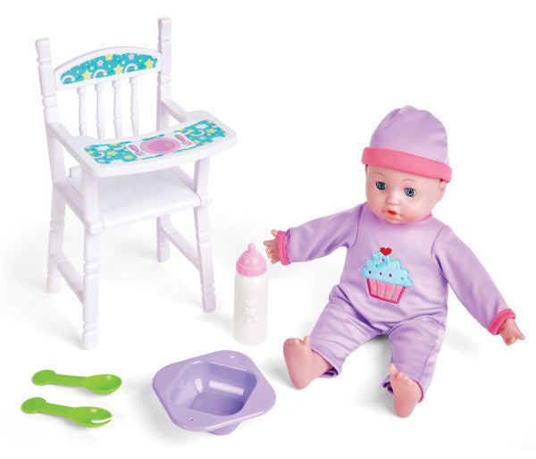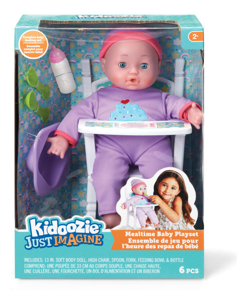 Kidoozie - Make mealtime fun with this 13" soft body doll playset. Includes doll, outfit, highchair, utensils, bowl, and bottle. Encourages imaginative play and fine motor skills. (And makes messy eaters a little less messy!)