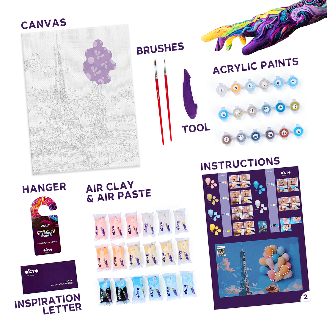 Oktoclay - See Paris and… finally spend time with yourself. Smell the fresh croissants, sip morning coffee while watching the sleepy city wake up, and stroll to the Eiffel Tower, pausing to savor the moment. Feel alive. Feel happy. If a walk through Paris still feels like a distant dream, let's bring it a little closer. With our painting kit, you can easily capture the atmosphere of the French capital, all without leaving your home.