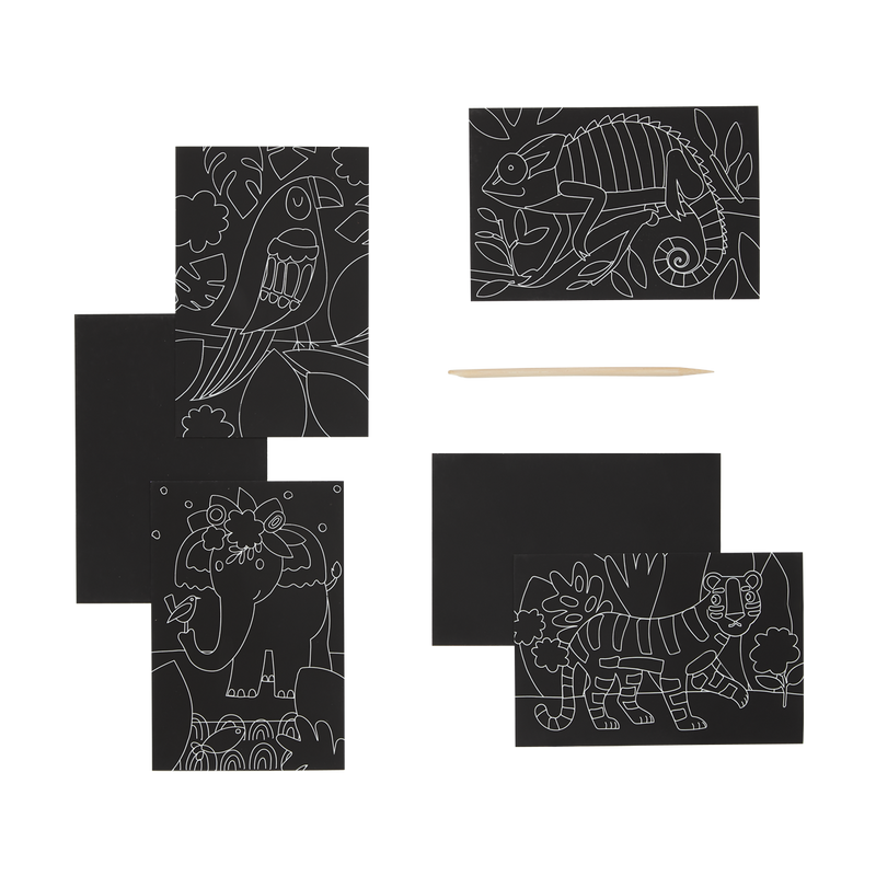 You never know what you might find in the jungle! A parrot? A tiger? A different cutie creature? Discover it all for yourself with this mini scratch art kit. Scribble and scratch the illustration using the wooden stylus—and a whole jungle-themed world will come to colorful life! Four different illustrations are included in this scratch art kit, as well as two blank scratch cards to create your very own work of art. This scratch art set is a great gift for busy hands and creative spirits!