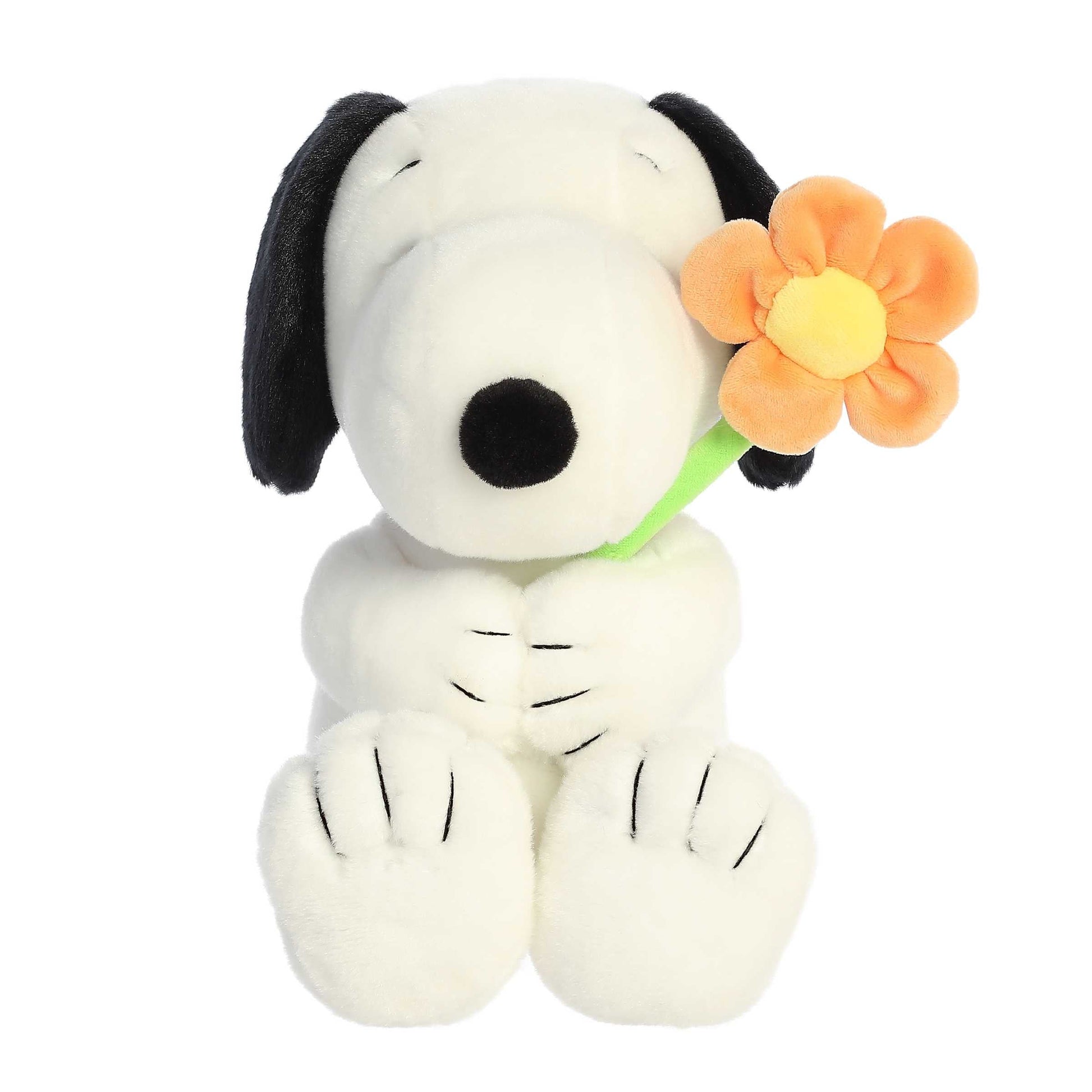 Aurora - Welcome the freshness of spring with the Snoopy with Flower plush from the Peanuts Collection by Aurora. This adorable plush features Snoopy holding a bright yellow flower, symbolizing the renewal and joy of the season.