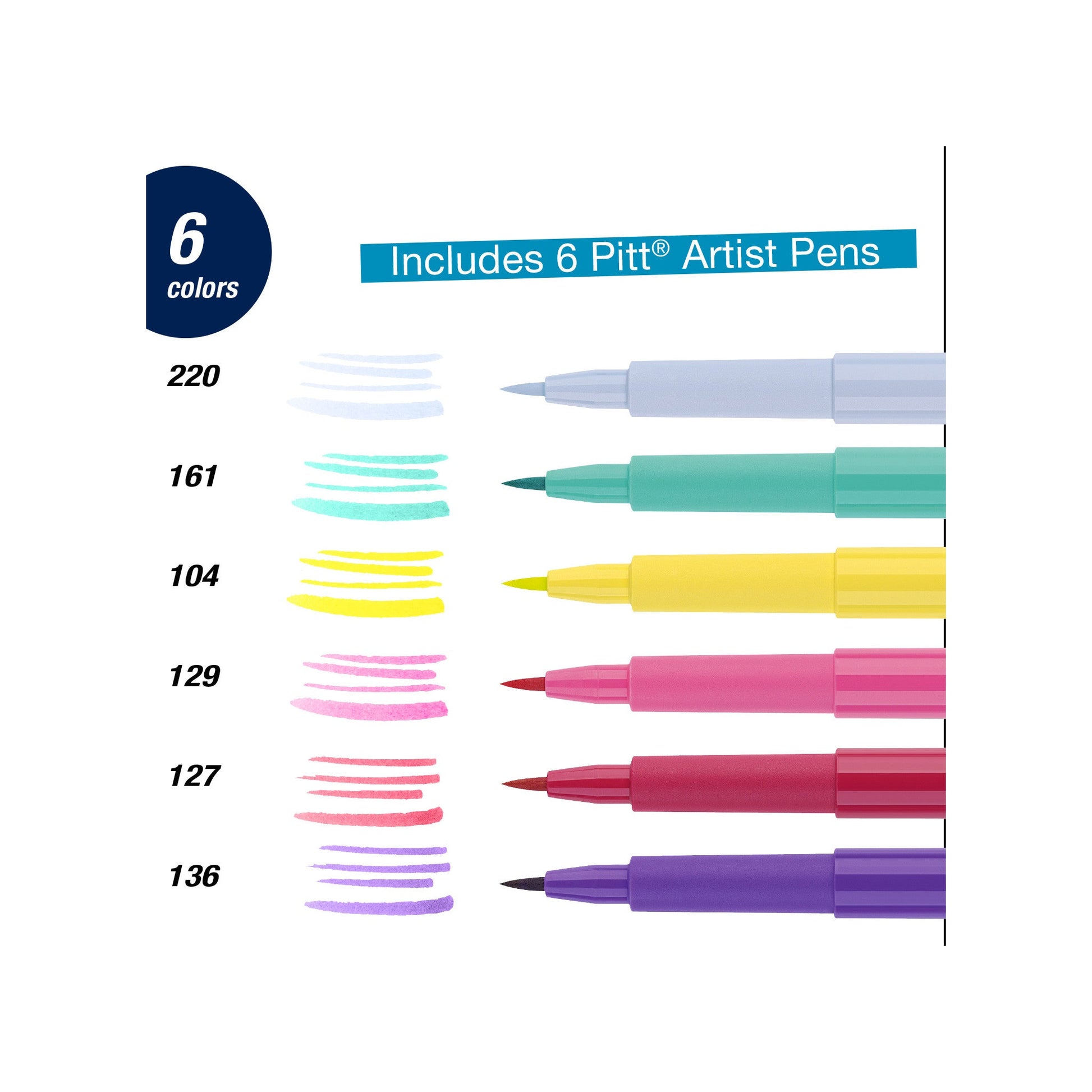 Contents Include: 6 Brush Pens #104 Light Yellow Glaze, #127 Pink Carmine, #129 Pink Madder Lake, #136 Purple Violet, #161 Phthalo Green and #220 Light Indigo in a wallet