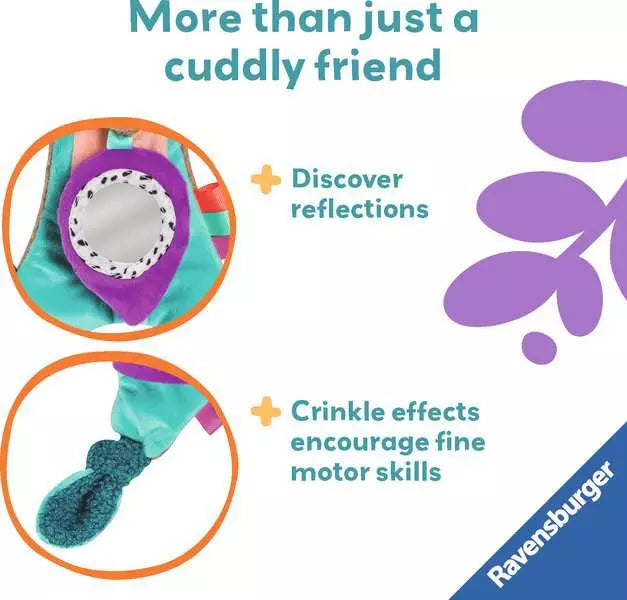 Ravensburger - This loveable meerkat activity toy will entertain baby while on the go. Multisensory details will keep little fingers busy, while the bright, silicone teething edge will help to soothe sore gums. Baby will love to hear the crinkle effects as they explore the bright colourful ribbons, fuzzy fabrics and knots. Who’s that in the mirror? It’s me! Baby will be captivated by reflections in the little mirror. Crinkle & Chew Meerkat is great for anytime play, and the handy clip makes it easy to take the fun along wherever you go!