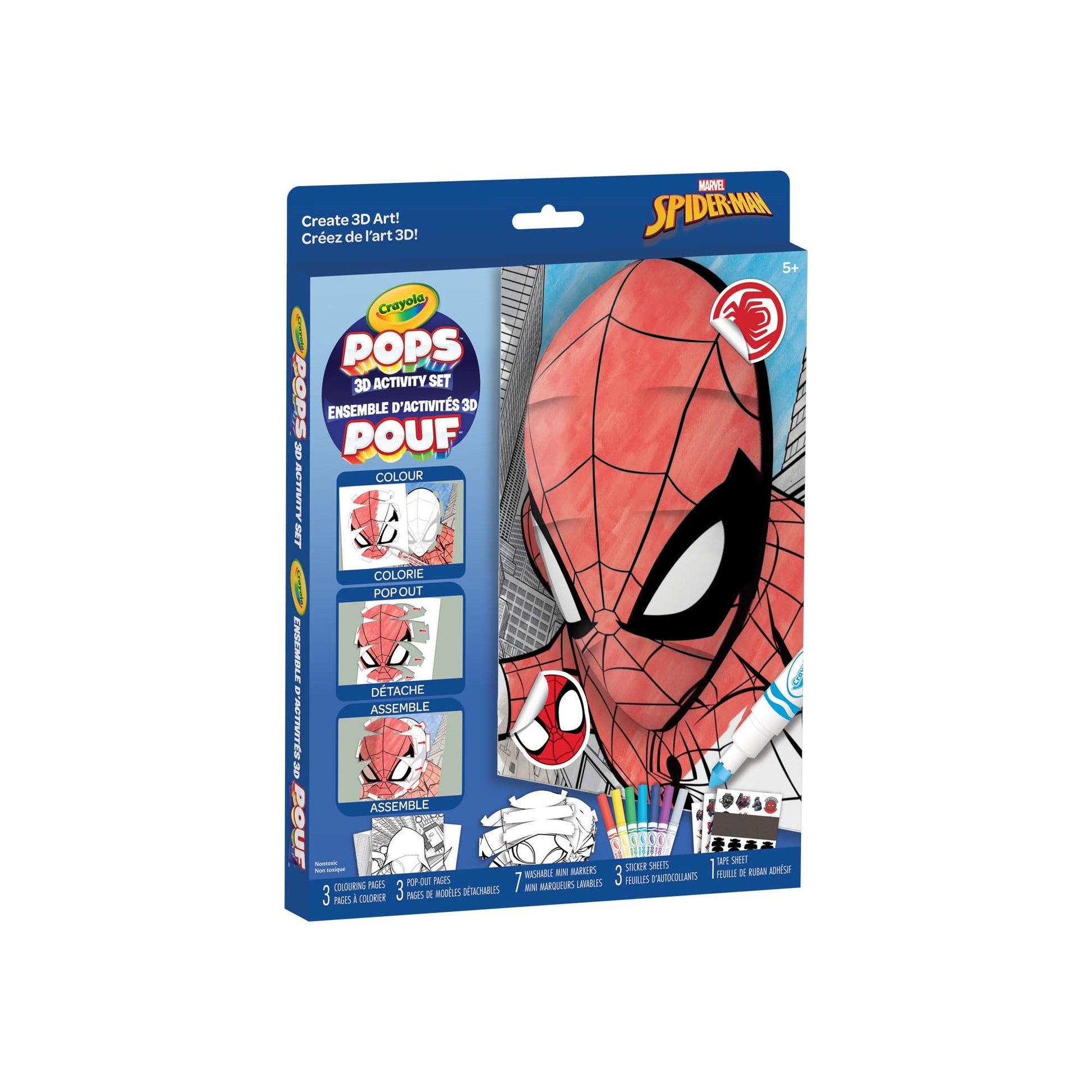 3D ACTIVITY SET: The Crayola POPS 3D Spiderman Activity Set includes 3 Spiderman Colouring Pages, 3 Pop-Out Pages, 3 Marvel Spiderman Sticker Sheets, 7 PipSqueaks Washable Markers, and 1 Tape Sheet.