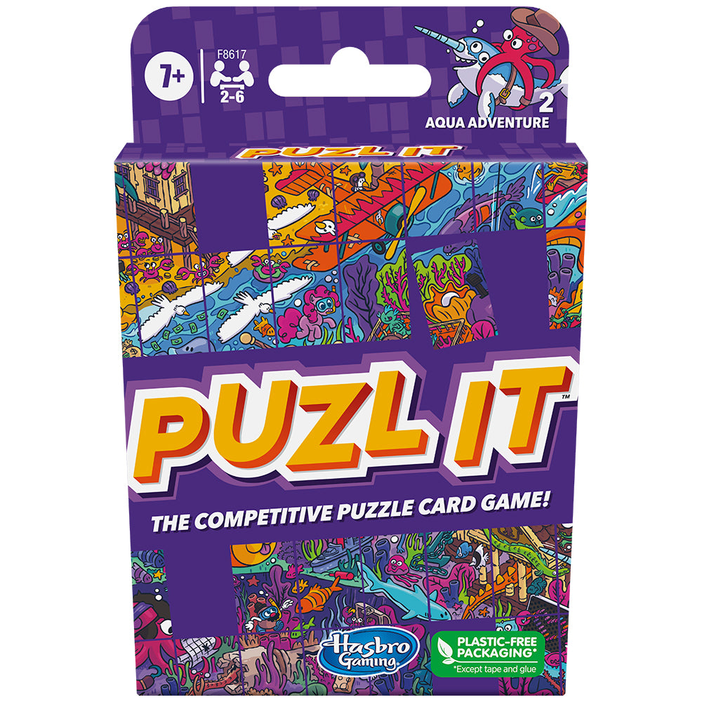 Hasbro - Is it a puzzle? Or is it a card game? It’s … both! The Puzl It game is the competitive puzzle card game! In this addictive, easy-to-play game, players take turns laying down cards from their hand to build a puzzle. The more cards they connect, the more cards they can steal from another player’s deck. But if a player gets a Blocker card, their deck is off limits! Be the last one with cards left to win! And as a bonus, the winner gets to complete the puzzle. With 72 thick, sturdy cards, the Puzl It family card game can be played over and over. It even comes with a handy reference poster to show players what the completed image should look like—a hilarious under-the-sea scene with lots of whimsical details to seek and find!