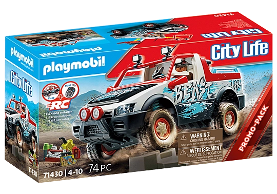 Hit the track with the cool Rally Car from PLAYMOBIL! Put on the helmet and start the next race with the PLAYMOBIL rally driver. Thanks to its movable front axle, the vehicle adapts effortlessly to any terrain. When the hood is opened, it reveals the engine block. Remove the roll-bar to insert the figures. The pickup truck is RC-capable and can be combined with both the 2.4 GHz RC module set (6914) and the Bluetooth RC module set (71397 - sold separately). A great playset for action-packed role-playing fun in the kids' room.