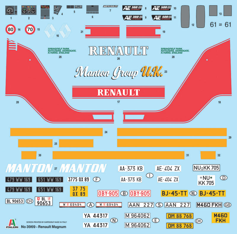 Italeri plastic model kit - Produced by the renowned French manufacturer Renault, the Magnum marked a clear break from tradition in the heavy commercial vehicle market. Introduced in 1990, it was immediately recognized for its innovative design, characterized by the cab’s angular lines—engineered to maximize onboard comfort for long-haul operations—which made it easily identifiable on the road. The cab was also structurally separated from both the chassis and the engine compartment, further enhancing driver comfort and ergonomics. Over time, the model underwent various technical and aesthetic upgrades and remained in production until 2013. The Renault Magnum can rightfully be considered a milestone in industrial and commercial transportation. It was also awarded the title of "International Truck of the Year" in 1991.