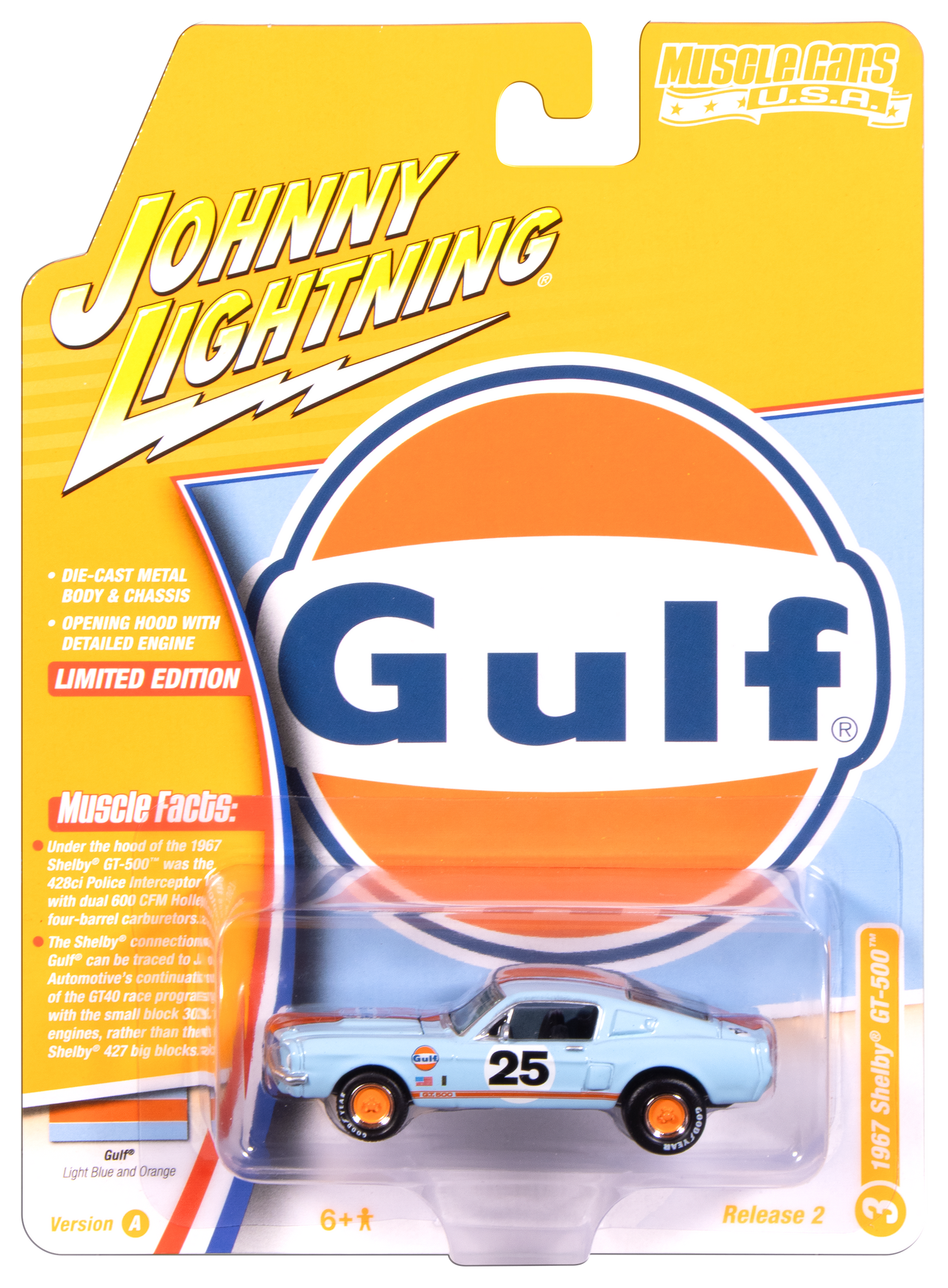 Johnny Lightning 1/64 diecasts - Muscle Cars 1967 Shelby GT-500 (Gulf Light Blue w/ Orange Stripe)