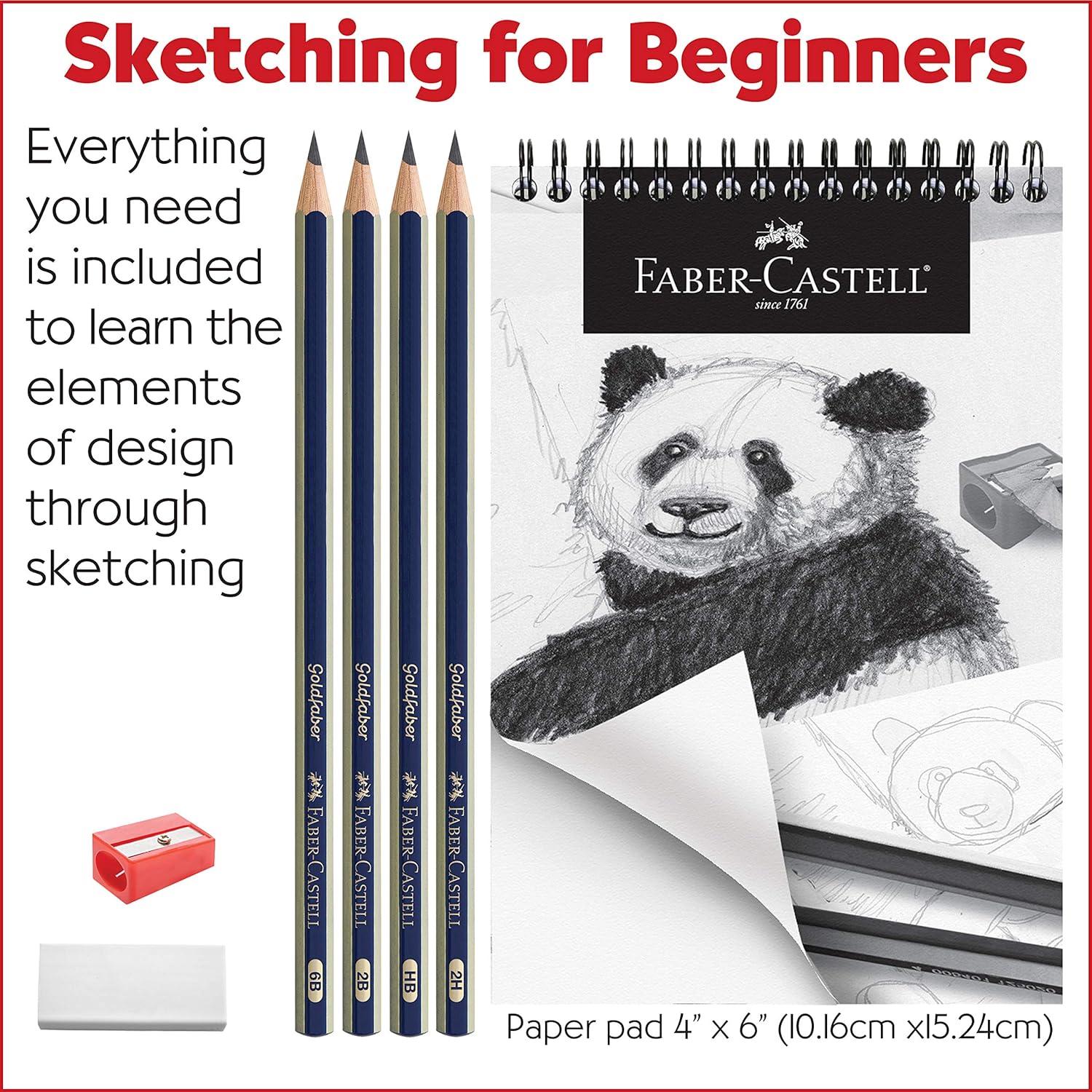 Faber Castell - Learn a new art technique with Faber-Castell Sketching Basics! This pencil sketching set is perfect for beginner artists and kids who are eager to learn to draw and explore the elements of design through sketching. Sketching Basics features guided instructions that teach and build creative confidence. Learn traditional drawing and sketching techniques such as blending, cross-hatching, shading and softening. Sketching is an engaging art activity for kids and beginners that allow you to express your creativity while learning about a new art medium. This drawing kit for kids set comes with everything you need to complete these techniques and more! Inside this kit you will find a travel friendly sketch book, 4 Faber-Castell quality graphite pencils (6B, 2B, HB and 2H) in a variety of lead hardness levels (assortment of lighter and darker graphite laydown shades), white eraser, pencil sharpener and instructions booklet.
