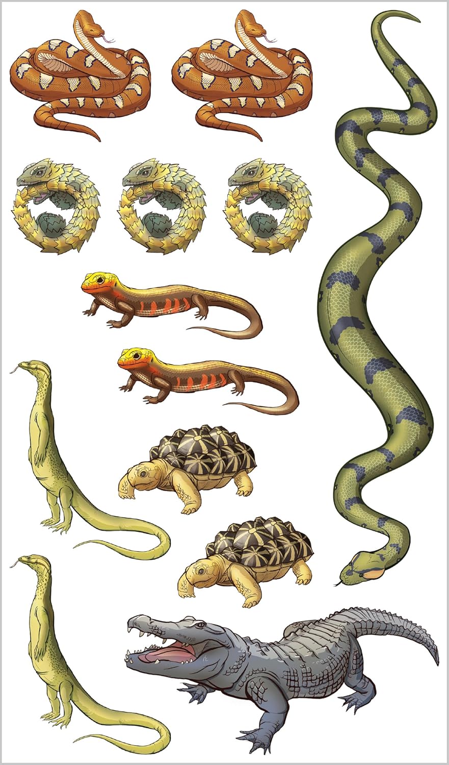 Snakes and reptiles are a fascinating favorite of animal lovers of all ages. These cool and creepy creatures slither, swim, stalk, and crawl across every page of Slithering, Scaly Tattoo Snakes & Reptiles. From the venomous Viper and Gila Monster to the nocturnal Gecko and camouflaging Chameleon, reptile-crazy kids will love to wear temporary art of their favorite species! 50 colorfully illustrated temporary tattoos are scientifically accurate and easy to apply with just a little water. Each featured species is accompanied by fun and fascinating facts. Did you know that the Texas Horned Lizard can startle predators by squirting blood from their eyes at a distance of up to five feet? Or that the Collared Lizard can run using only its back legs? Kids will love quizzing their friends on newly learned animal trivia while showing off their interesting ink.