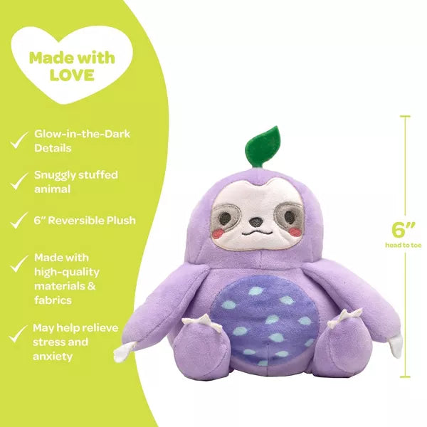 Adora - Introducing the Snuggle and Glow Reversible Sloth - the ultimate nighttime companion! Fear of the dark is no match for this adorable plushie, offering a comforting glow that helps ease bedtime worries and aids in sleep training. With its charming purple body and reversible design featuring an awake and sleeping face, this 6" cuddly Sloth becomes a cherished friend for kids aged 1 and up. Crafted from unbelievably soft fabric, its perfect for snuggling all night long, providing a sense of security and tranquility. Powered by sunlight, it illuminates at night, making it an ideal alternative to a traditional night light.