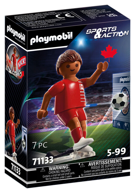 The PLAYMOBIL soccer stars are back in action. The national player from Canada gives everything for his team. Which team will win? With the practical one-hand kick function, both flat and high balls can be placed precisely. Includes cardboard goal wall. Combine with the soccer stadium (71120) for even more soccer fun. With the enclosed blank labels, the figure can be individually labeled with the name and serial number of the favorite player.